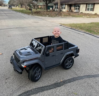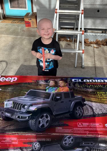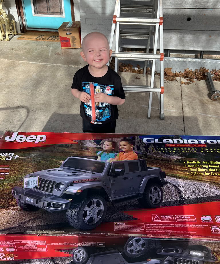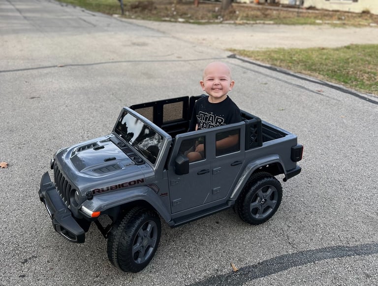 Thank you again so much for his ride-along Jeep. He is absolutely thrilled about it. On days when chemo makes his joints hurt, this will be such a blessing—and it means the world that he can still keep up with his big brother on his bike. We are incredibly grateful for your kindness and thoughtfulness.